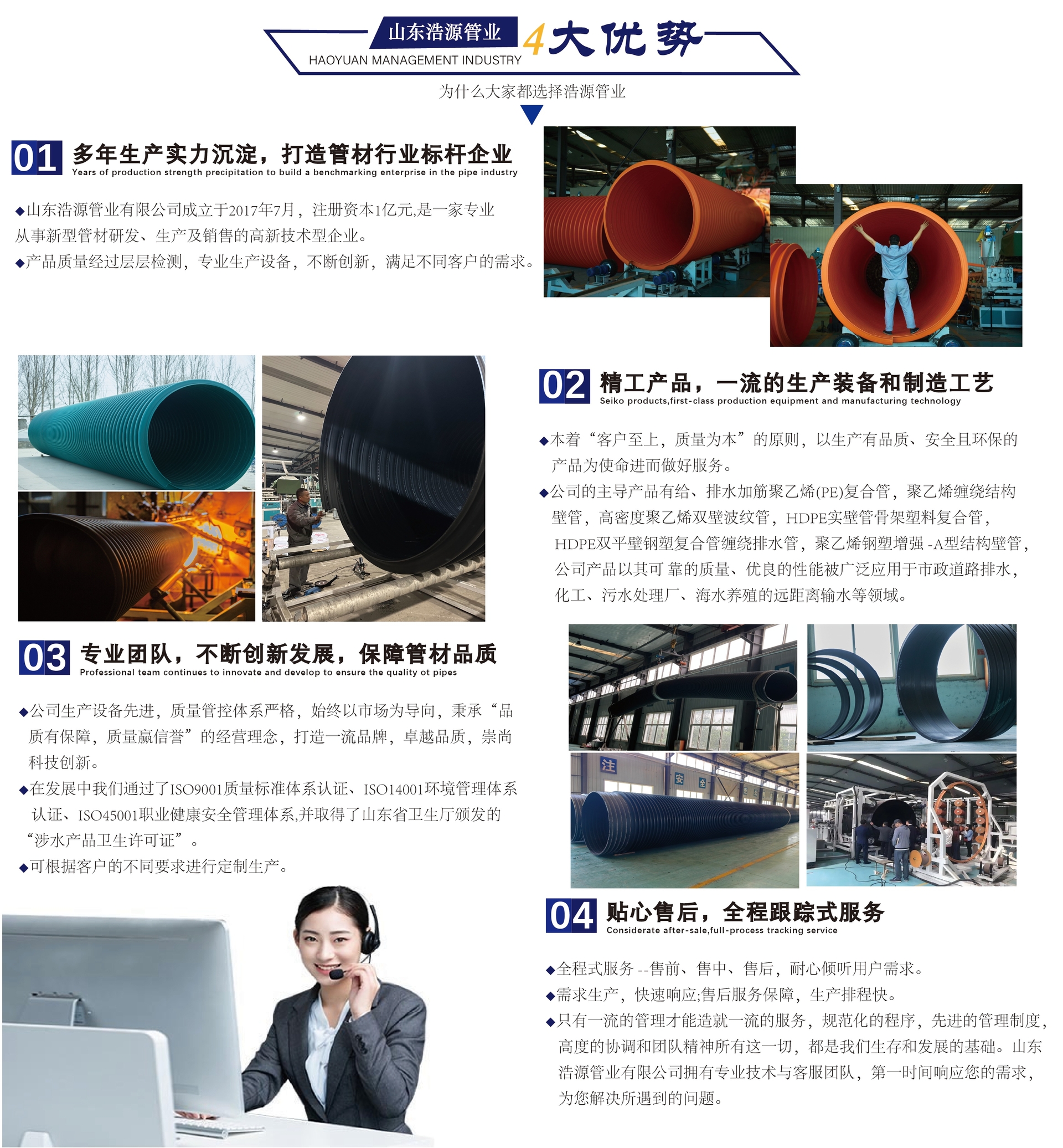 山東浩源管業(yè)有限公司成立于2017年7月,注冊(cè)資金為1億元,是一家專注于高分子復(fù)合新材料產(chǎn)品研發(fā)、推廣、生產(chǎn)、銷售一體的高新技術(shù)型企業(yè)。公司引進(jìn)了十多條產(chǎn)品生產(chǎn)線。本著“客戶至上,質(zhì)量為本”的原則,建立了嚴(yán)格的質(zhì)量標(biāo)準(zhǔn)檢驗(yàn)體系,以生產(chǎn)高品質(zhì)、高性能、安全、環(huán)保的產(chǎn)品為使命。公司主導(dǎo)產(chǎn)品:加筋聚乙烯(PE)復(fù)合管、給水用高分子量聚乙烯鋼絲復(fù)合管、聚乙烯纏繞結(jié)構(gòu)壁管、HDPE雙平壁鋼塑復(fù)合管、聚乙烯鋼塑增強(qiáng)管等。以其可靠的質(zhì)量、優(yōu)良的性能被廣泛應(yīng)用于市政道路排水,化工、污水處理廠、以及大口徑遠(yuǎn)距離輸水等領(lǐng)域。